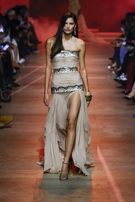 من يتابع أعمال إيلي صعب سيجد أن توقيعه في القصّات الأنثوية لا يخبو، ولذلك في هذه المجموعة استمر في التركيز على الخصر، التفاصيل التي تُبرز التكوين الطبيعي للجسد، والانسيابية في الانتقال بين الأجزاء.