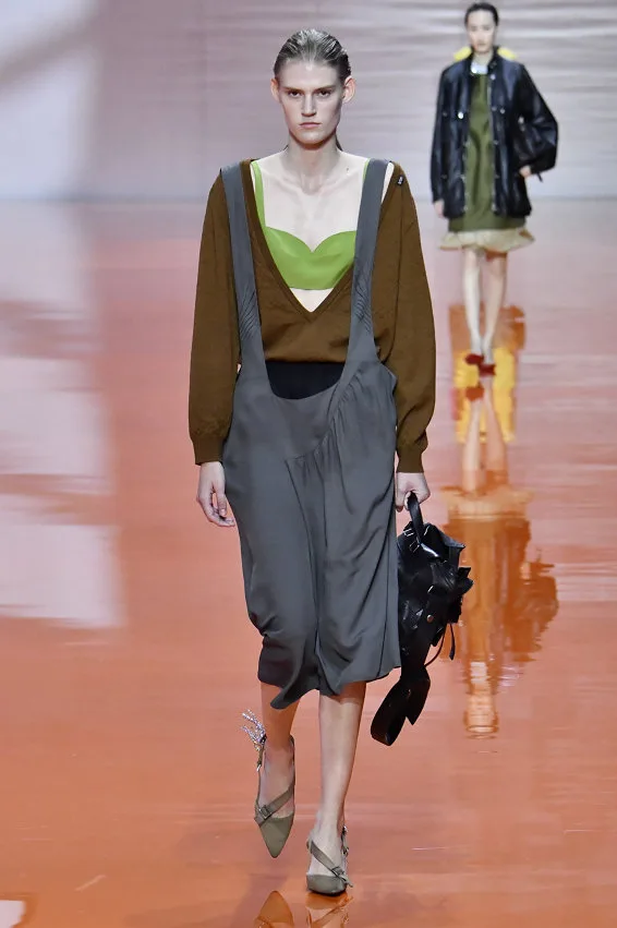 في مجموعة برادا لربيع وصيف 2026، تبرز الفساتين كرمز للأناقة المعاصرة. قدمت برادا تصاميم هندسية مع خطوط واضحة وألوان نابضة بالحياة مثل الأخضر الليموني، البنفسجي الغني، والوردي الباستيل. بعض الفساتين تميزت بالقصات المنسدلة التي تمنح حرية الحركة، بينما اتسمت أخرى بالتنورة المنفوخة التي تضيف لمسة رومانسية كلاسيكية. التفاصيل الدقيقة مثل التطريز اليدوي والخرز الدقيق جعلت كل قطعة لوحة فنية متحركة.