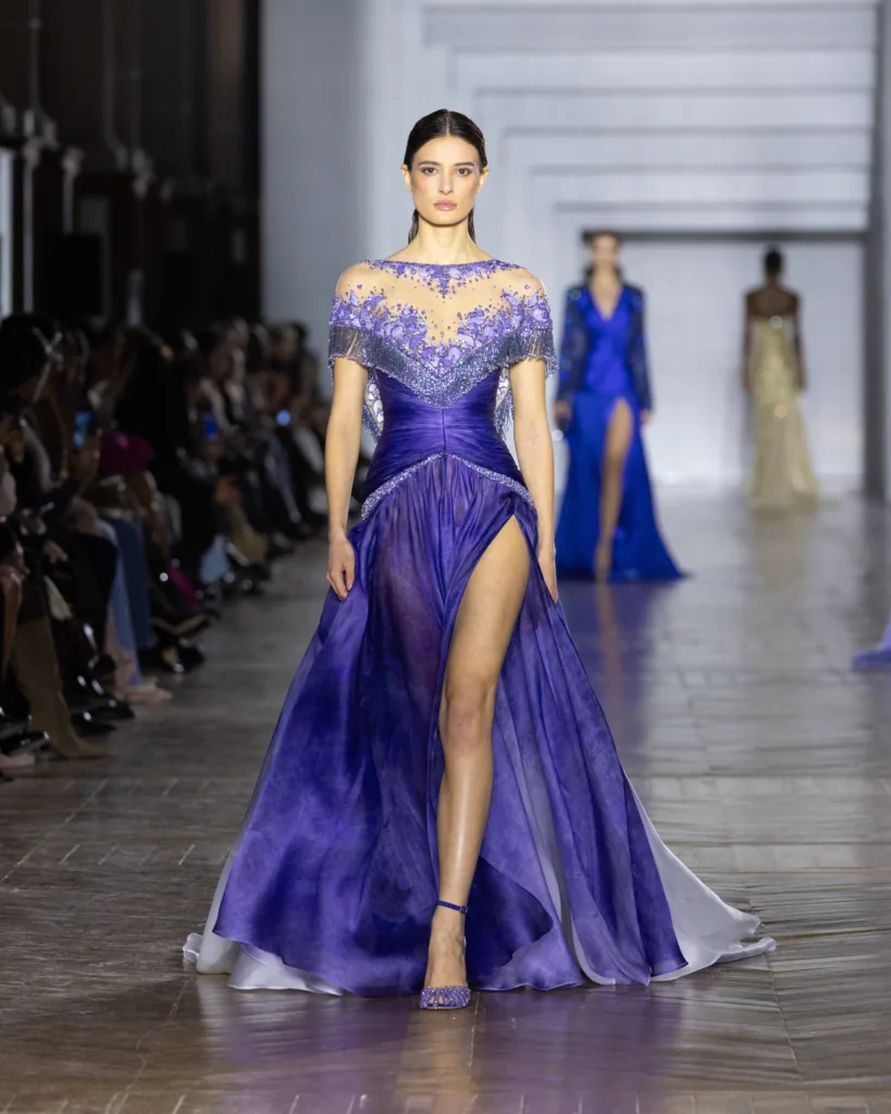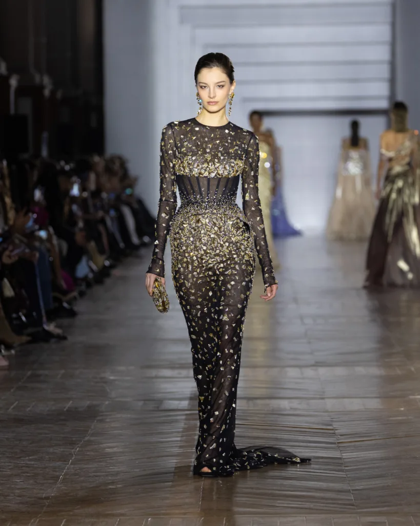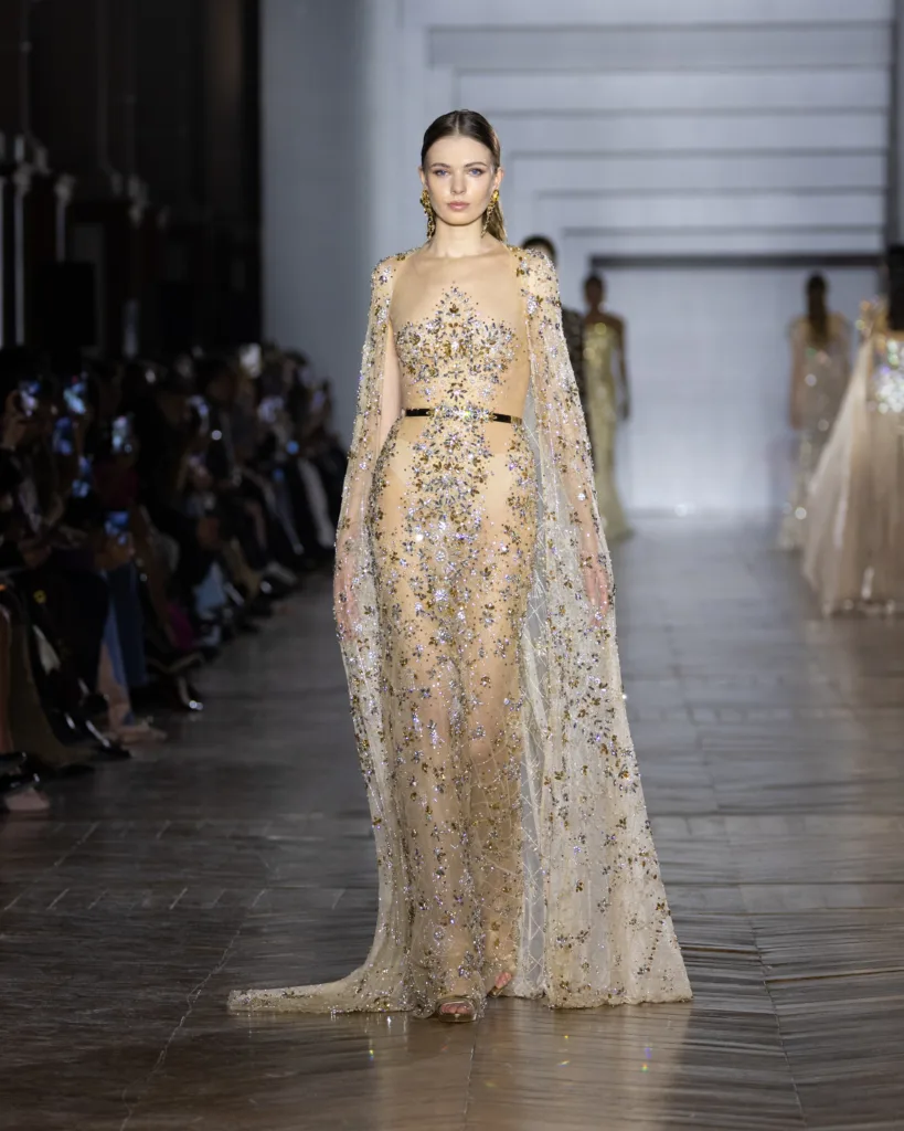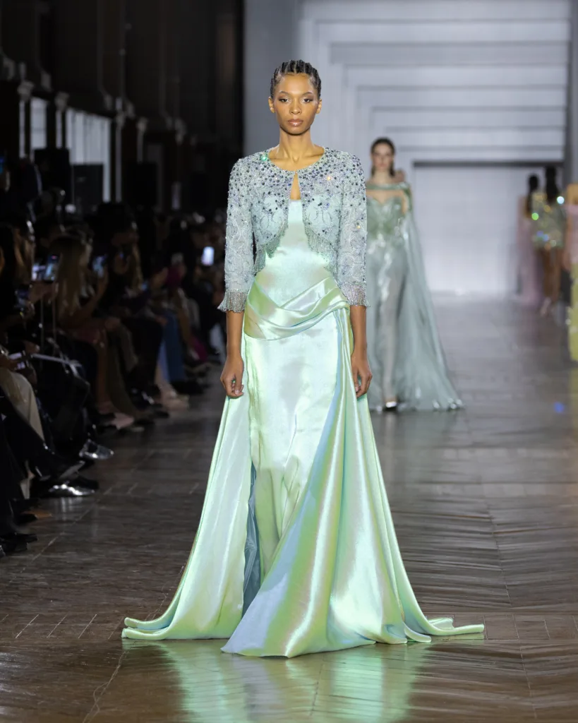 أما لوحة الألوان، فليست اختيارًا جماليًا فقط، بل قرارًا بصريًا قائمًا على التفاعل مع الضوء. تتدرّج الألوان في انتقالات ناعمة مستوحاة من تبدّلات الإضاءة: درجات كريستالية، نغمات باستيل، ولمسات معدنية محسوبة، تتوازن بتباينات دقيقة وإضاءات خفية. حتى اللون يبدو هنا كأنه «يعمل» لا «يظهر»؛ يمنح القصّات انسيابية ووهجًا وحياة في الحركة، وكأن القماش يبدّل مزاجه مع تغيّر الإضاءة.