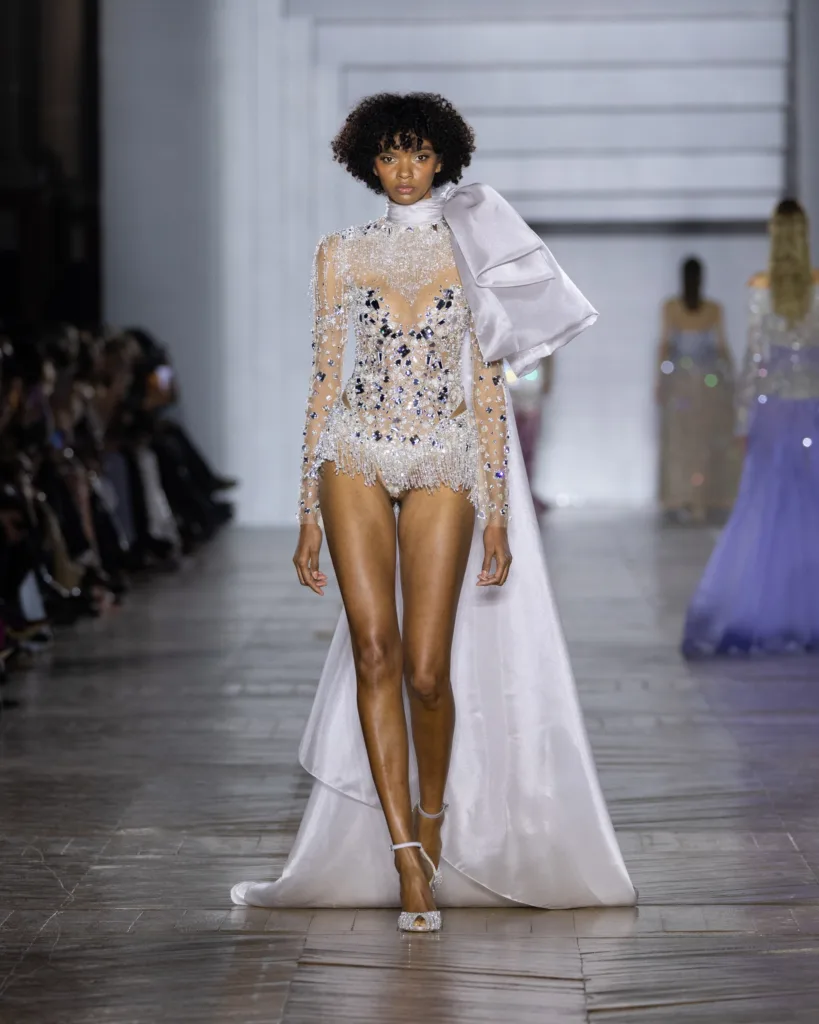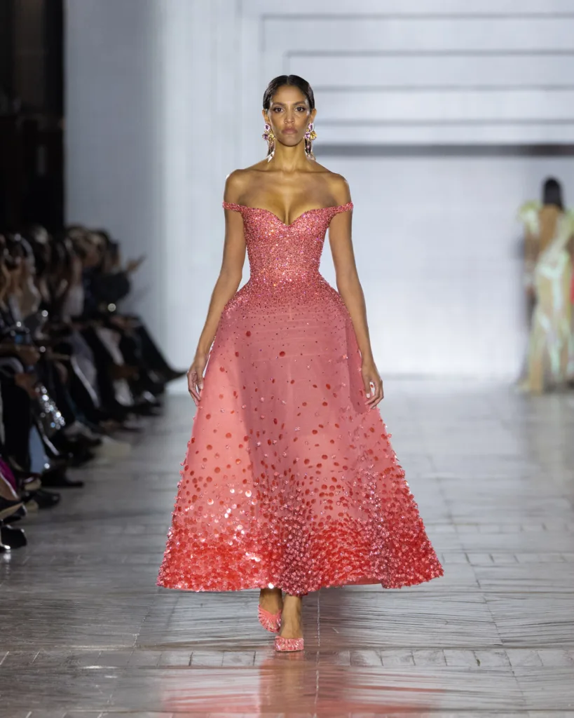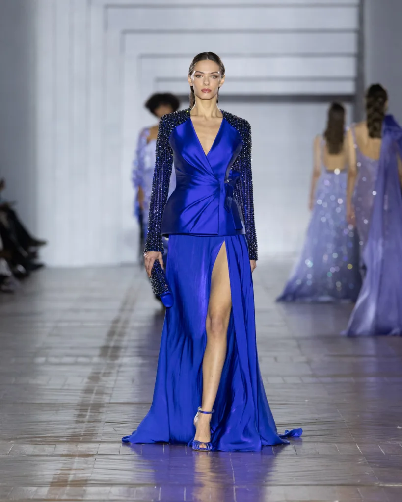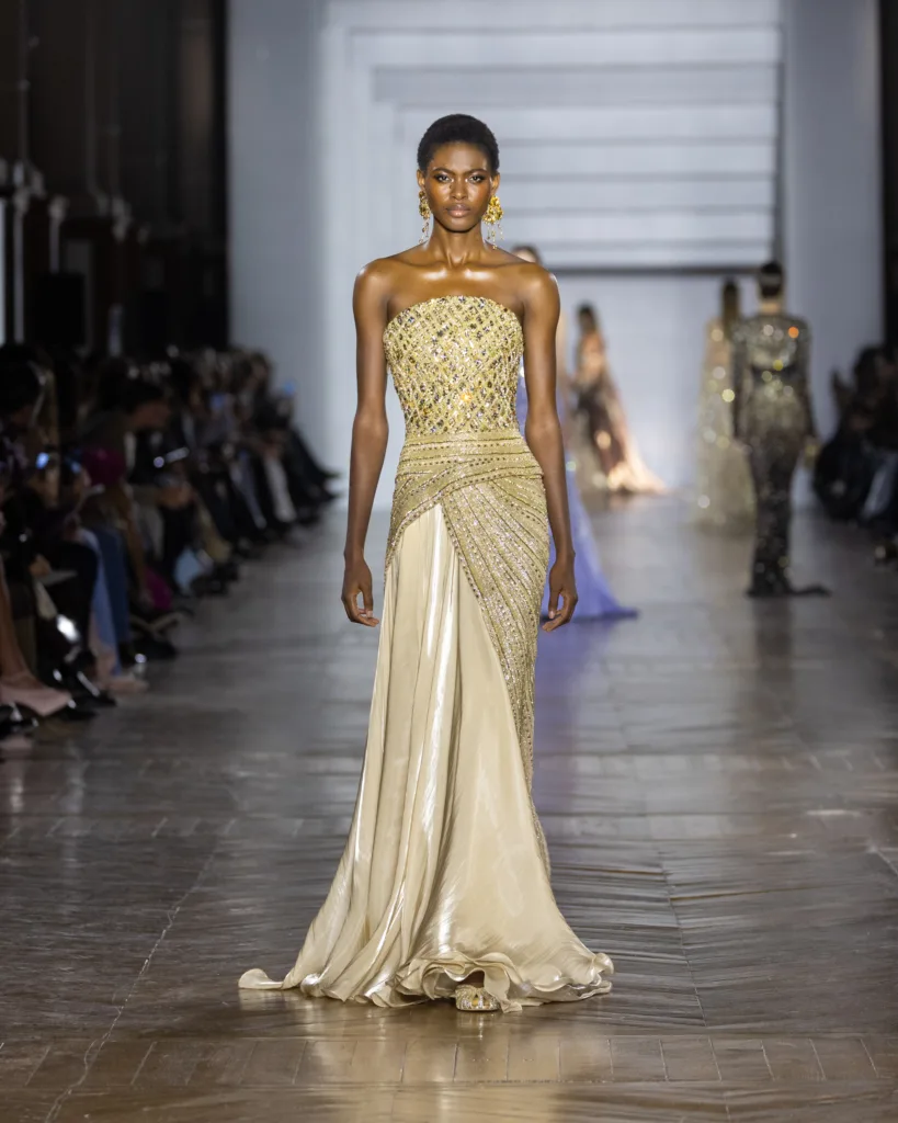 أما لوحة الألوان، فليست اختيارًا جماليًا فقط، بل قرارًا بصريًا قائمًا على التفاعل مع الضوء. تتدرّج الألوان في انتقالات ناعمة مستوحاة من تبدّلات الإضاءة: درجات كريستالية، نغمات باستيل، ولمسات معدنية محسوبة، تتوازن بتباينات دقيقة وإضاءات خفية. حتى اللون يبدو هنا كأنه «يعمل» لا «يظهر»؛ يمنح القصّات انسيابية ووهجًا وحياة في الحركة، وكأن القماش يبدّل مزاجه مع تغيّر الإضاءة.