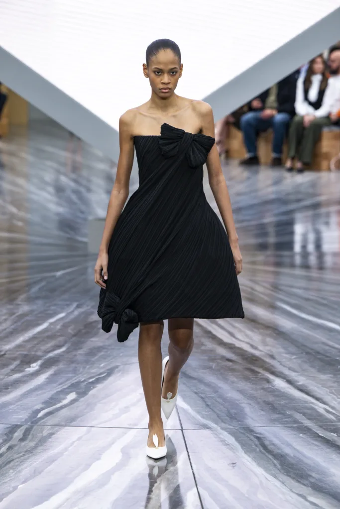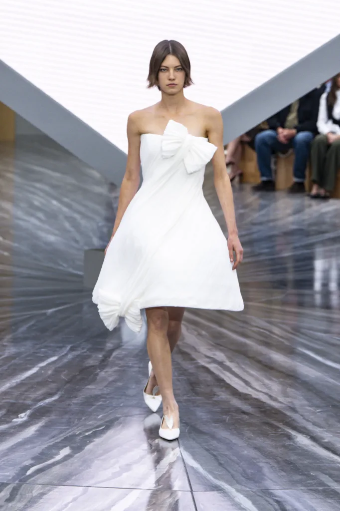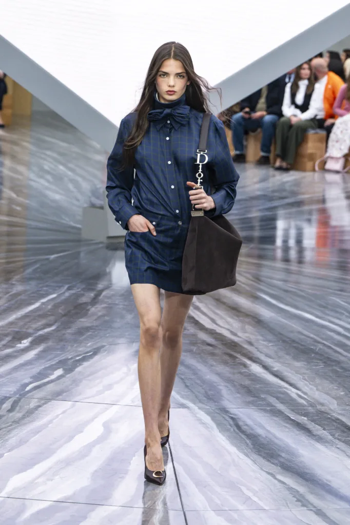 جاءت مجموعة ديور لربيع وصيف 2026 مزيجًا بين تصميمات كريستيان ديور وجون غاليانو وراف سايمونز، وصولًا إلى ماريا غراتزيا كيوري. فقد ظلت روح الدار الأصيلة حاضرة، وأضاف إليها جوناثان أندرسون لمساته الخاصة. رأينا الفساتين القصيرة والمتوسطة الطول، والبلوزات الضيّقة التي تبرز قوام الجسد، والتنانير القصيرة للغاية، جميعها مزينة بالفيانكات التي ترمز إلى ميس ديور.