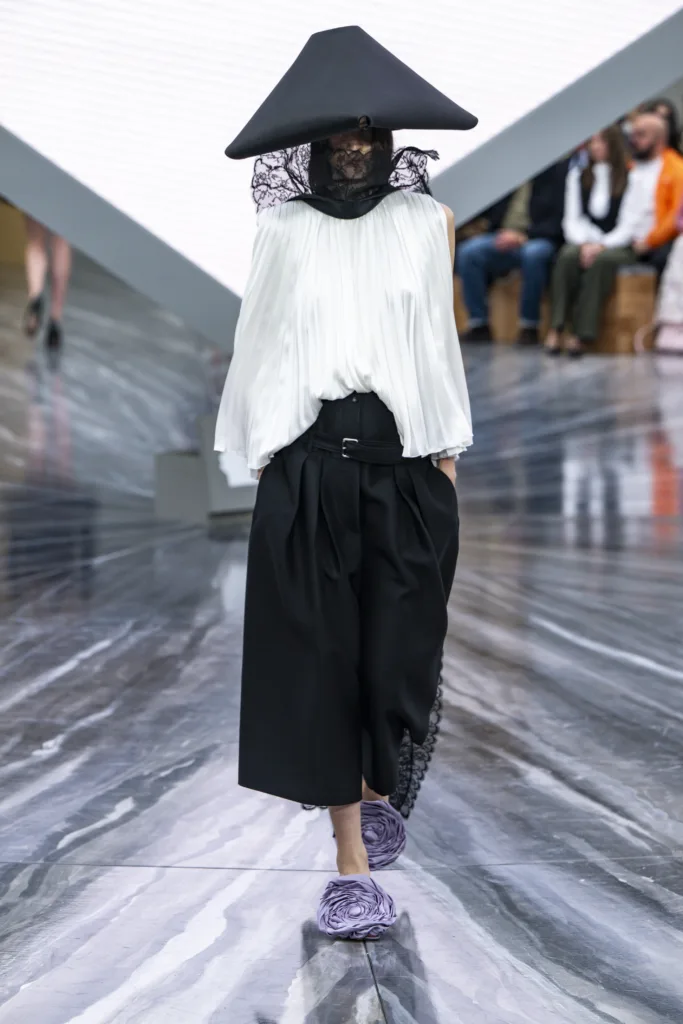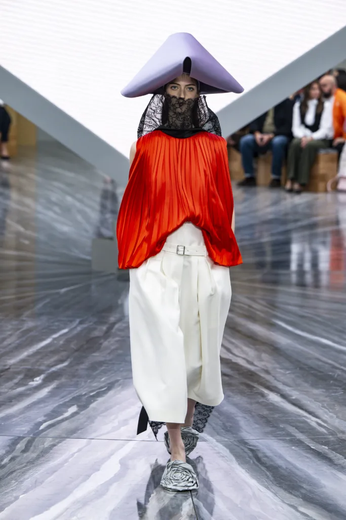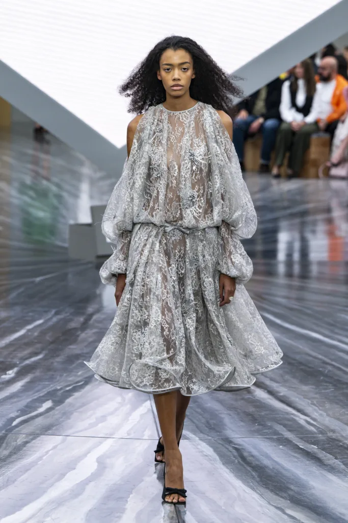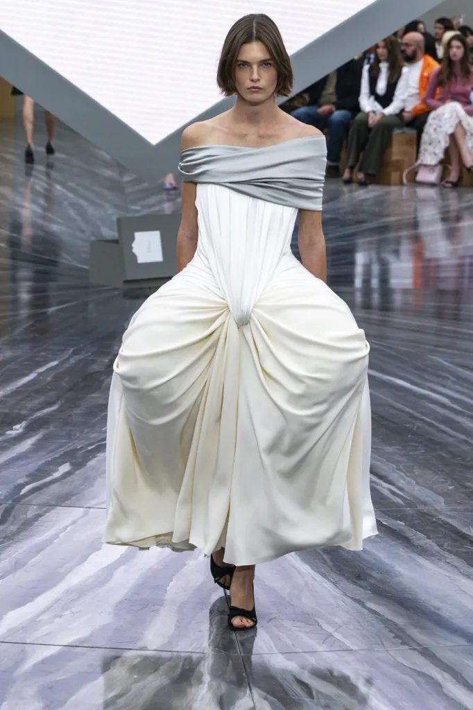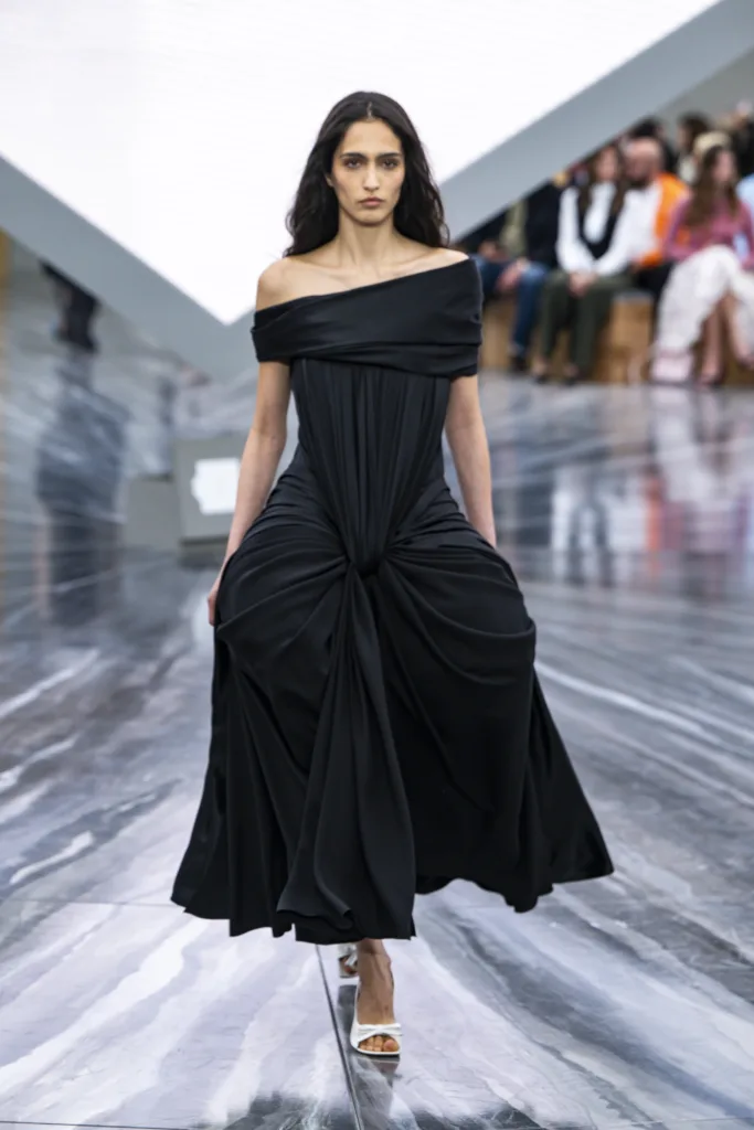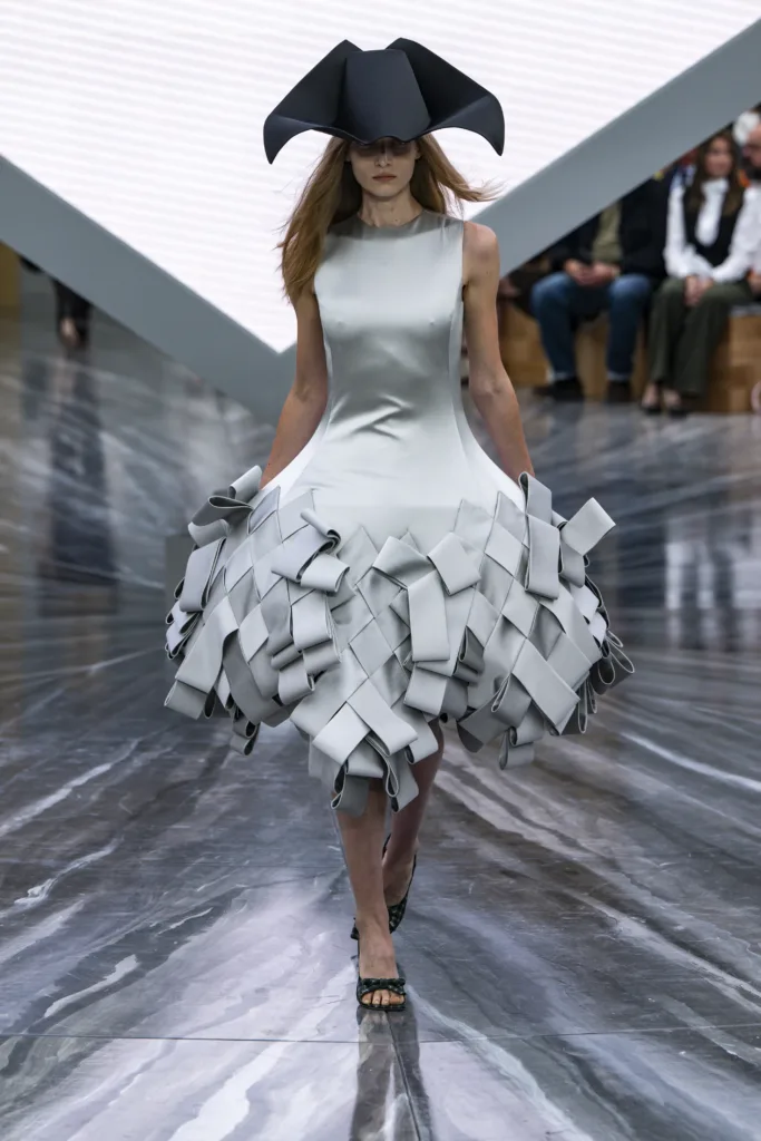 وقد تمحور الإبداع حول القصات وأحجام القطع، إذ مزج المصمم بين أصالة الماضي وجرأة الحاضر، فرأينا الخصر المحدّد، والبُنى الهندسية الدقيقة، والنقوش الصاخبة. كما استلهم أيضًا من فن الأوريغامي، مضفيًا لمسة فنية آسرة على تفاصيل المجموعة.