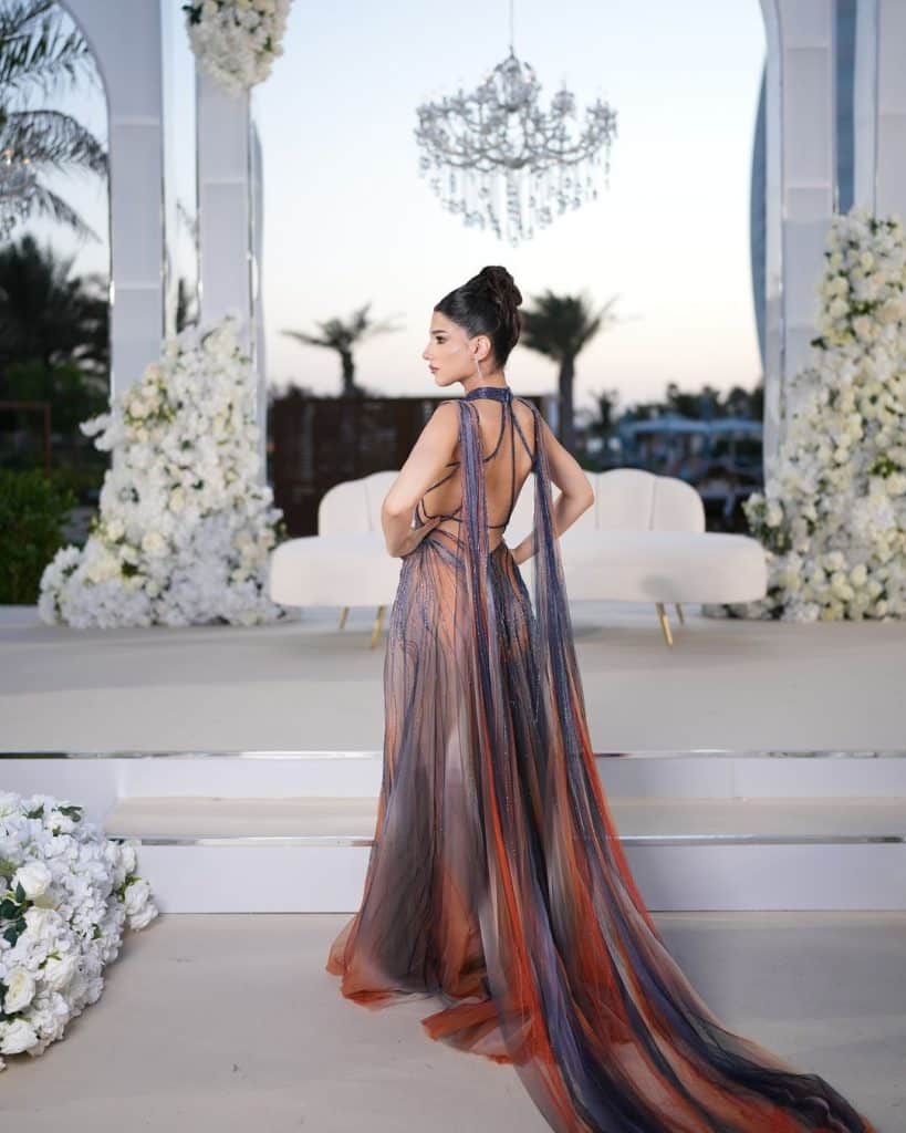 هذا الثوب الأنيق والرائع الذي يجمع بين اللون البرتقالي الدافئ والأزرق يعد من أكثر التصميمات رقة وانسيابية، خاصةً مع القماش المنسدل في نعومة على الظهر، مع القصة الانعكاسية على الصدر.