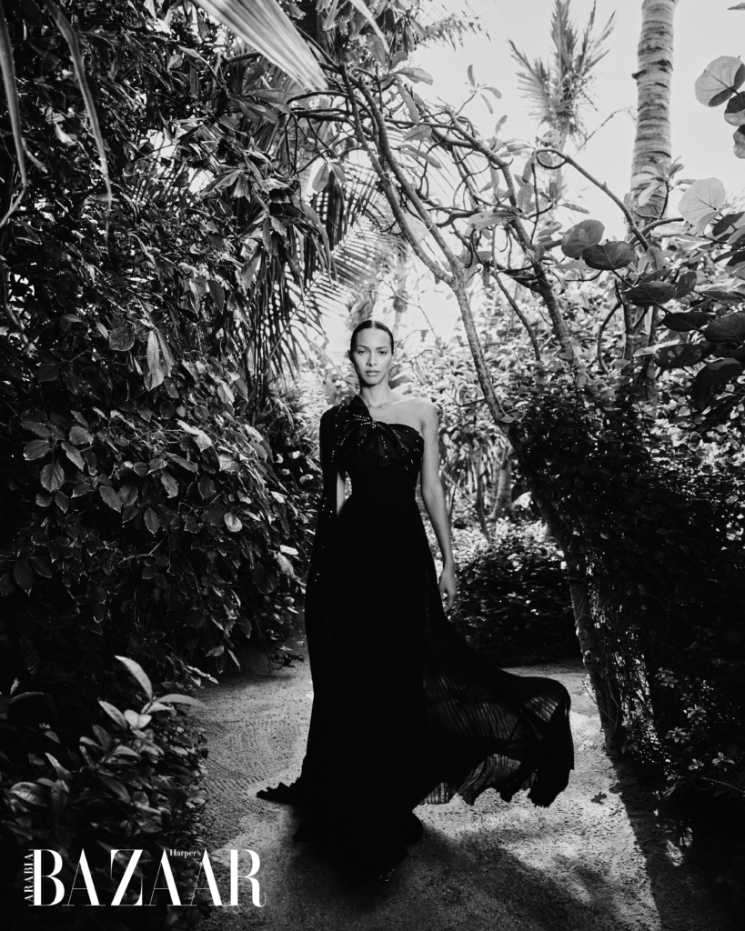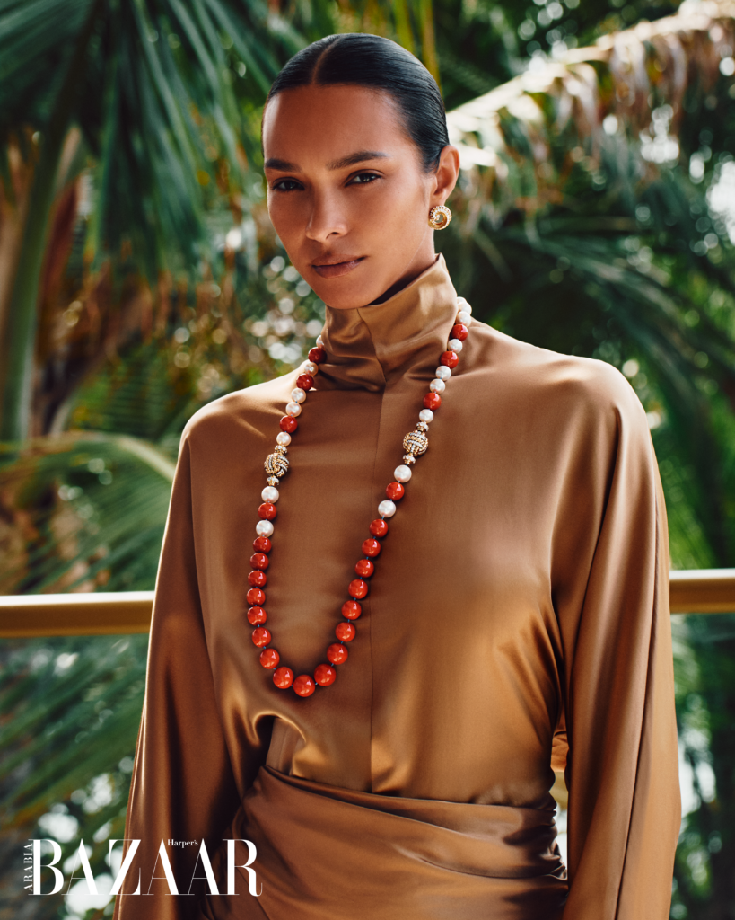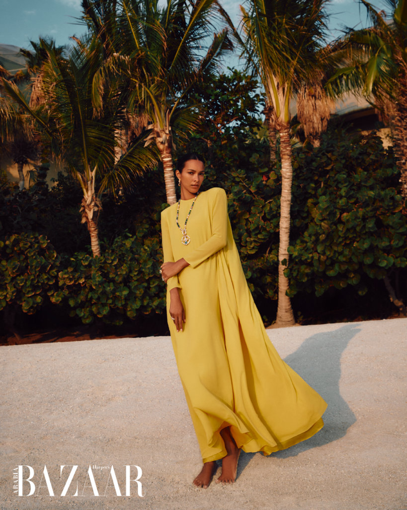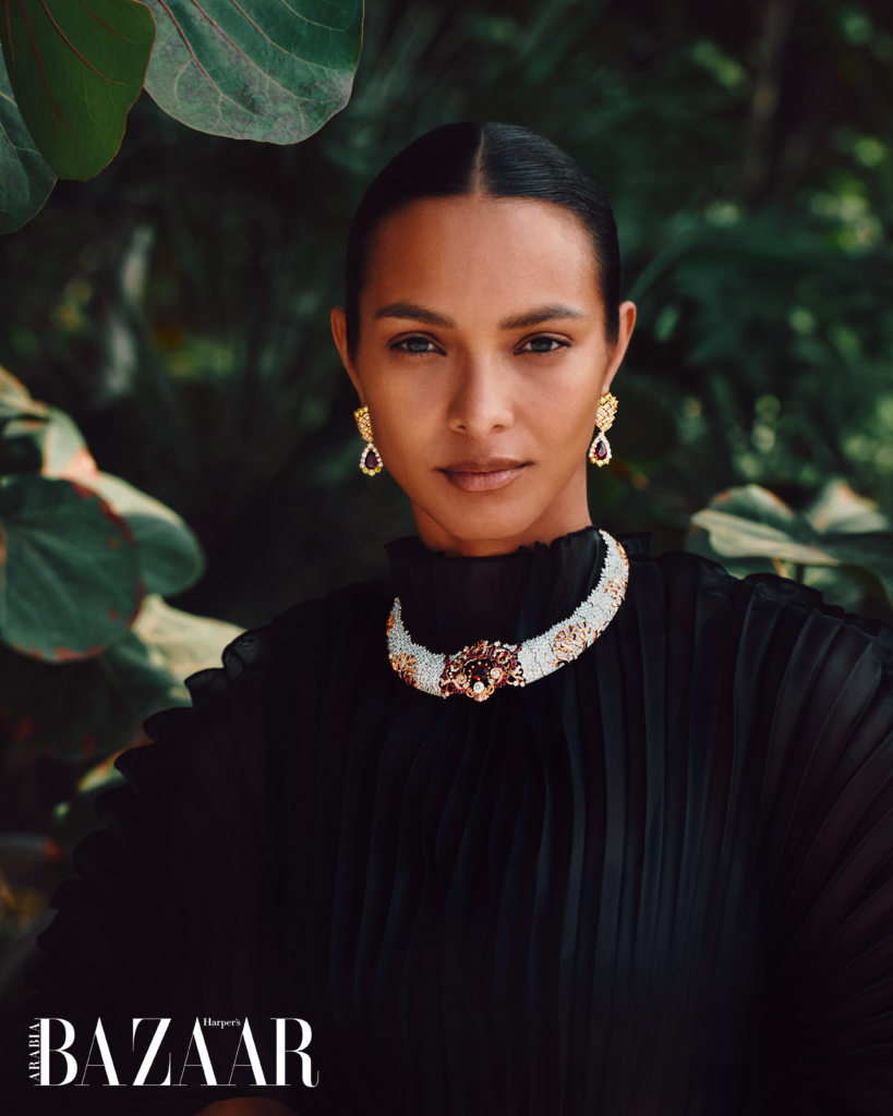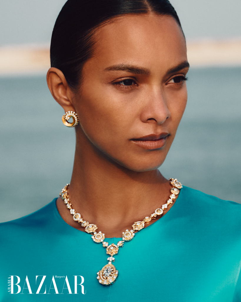 نغوص معها في تفاصيل زيارتها الأولى إلى دبي، ونسألها: هل الصورة النمطية المتداولة عن المدينة واقعية أم مبالغ فيها؟ فتجيب: “انبهرت أكثر مما توقعت. شاهدت بريقًا يوازي بريق المجوهرات التي ارتديتها في هذا التصوير. قطع وكأنها من خزائن الملكات، والدليل الإجراءات الأمنية المشددة التي رافقتها. لم أعش تجربة مماثلة من قبل، سوى عندما ارتديت حمالة الصدر الخيالية من فيكتوريا سيكريت”. وتضيف ضاحكة: “أتظنون أنني سأستولي على المجوهرات وأقفز بها إلى المحيط؟”