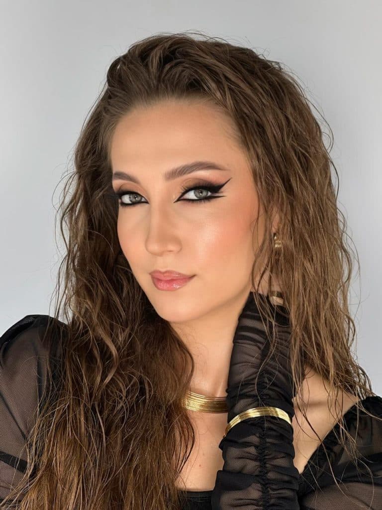 في ذلك اللوك تم تطبيق ظل عيون من درجات البيج كقاعدة على الجفن، وعلى على طرف العين الخارجية تم استخدام ظلال عيون بنية داكنة لإضفاء المزيد من العمق للعين، مع تطبيق الآيلاينر الأسود بأسلوب جريء على امتداد خط الرموش العلوي، وتكثيفه قريبًا من زاوية العين الخارجية لإبرازها بطريقةٍ أكبر، مع استخدام الآيلاينر الأسود على جزء الرموش السفلية الخارجي بخط رفيع لتعزيز حدة العيون.