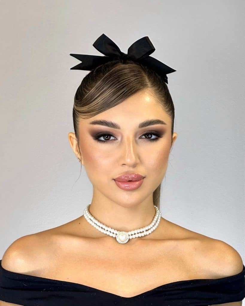 وعلى الرموش العلوية والسفلية تم تطبيق ماسكارا سوداء لإضفاء لمسة مذهلة نهائية مع تثبيت الرموش الاصطناعية كذلك، وعن أحمر شفاه تم اختيار لون نيود لامع من أجل إبراز جمال الشفاه بطريقة أنيقة وطبيعية، والذي تم تطبيقه على الشفتين بشكل متساوٍ، مع تحديد الشكل الشفاه الطبيعي.