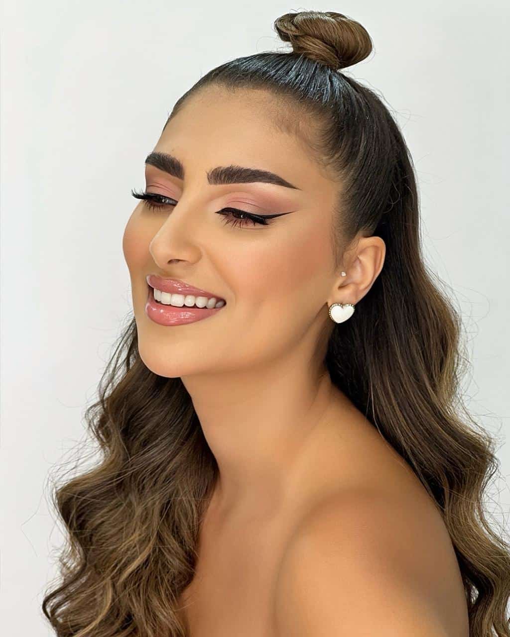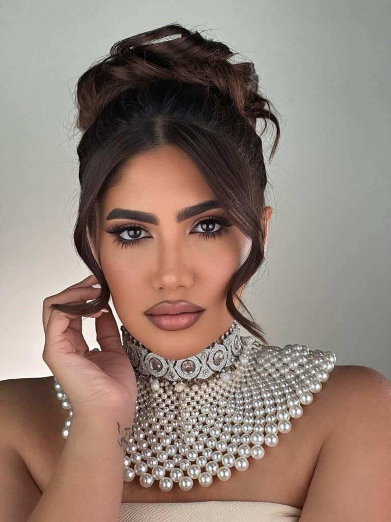 اختار خبراء التجميل هنا تطبيق مكياج ناعم ومميز لنور ستارز صانعة المحتوى، فقد تم رسم العيون بواسطة الآيلاينر الأسود وتطبيق ظلال العيون ذات الألوان الدافئة لإبراز جمالها، وتمشيط وتحديد الحواجب بطريقة طبيعية.