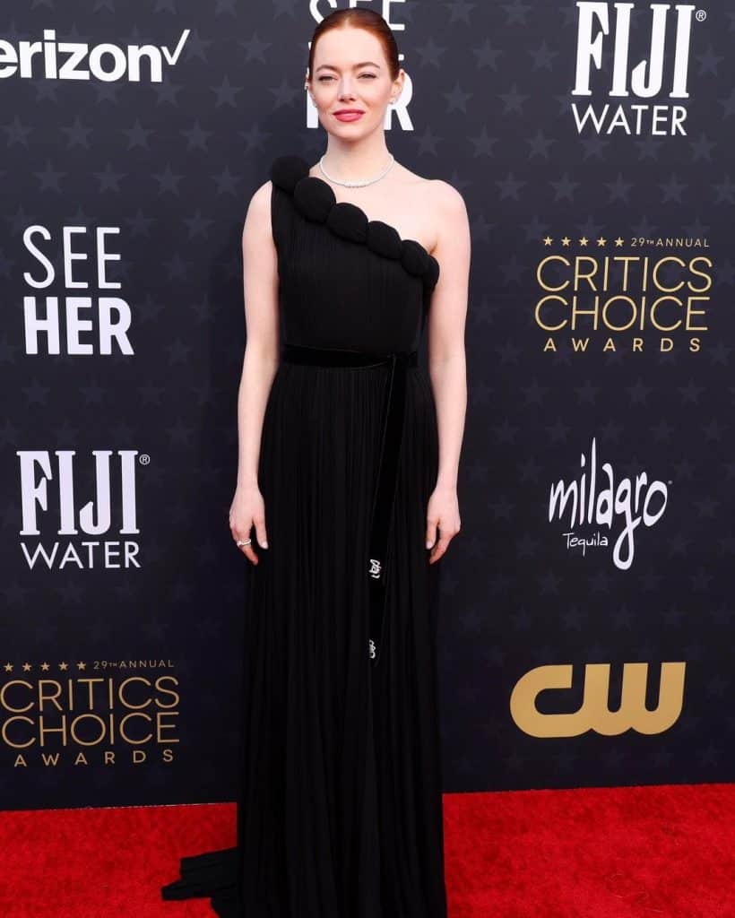 لطالما لاقت البساطة بإيما ستون، سفيرة دار لويس فيتون. حيث ملئت السجاد الأحمر لموسم توزيع الجوائز بأفضل القطع التي صممتها الدار الفرنسية في الفترة الأخيرة، ومنها هذا الفستان الذي يمزج المخمل بنعومة شديدة من خلال حزام الخصر المنسدل إلى الركبتين. والمجوهرات الناعمة التي منحتها أسلوب الستينيات ببراعة وساعد في ذلك أيضًا تسريحة الشعر الحريرية.