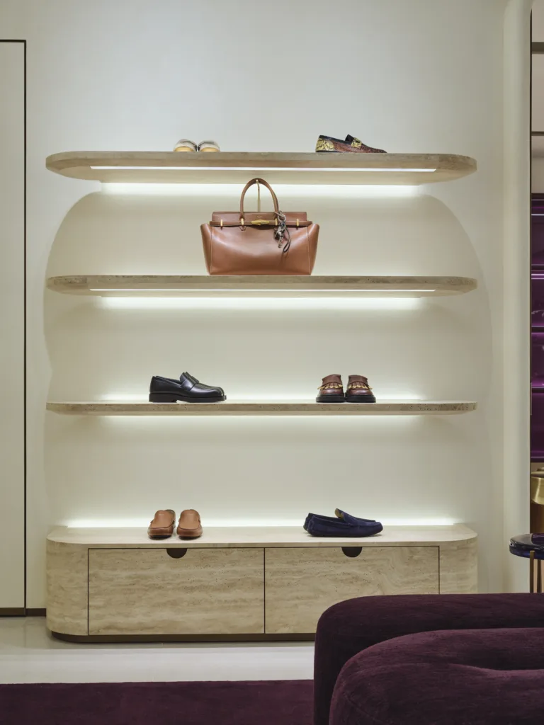 جاء تصميم المتجر بتوقيع استوديو نبيه جهان، الذي مزج بين الطابع العالمي للدار وروح دبي المميزة. فالتفاصيل المعمارية تجمع بين النعومة والبنية الهندسية الجريئة، فيما الألوان الغنية والملمس الناعم يخلقان توازنًا راقيًا يعبّر عن هوية جيمي شو بكل وضوح.