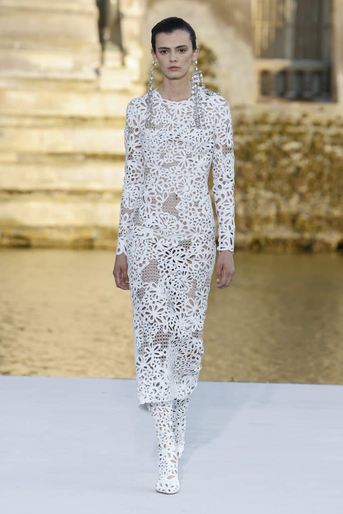 إذا حالفك الحظ لتزور متحف أم كلثوم بمنطقة المنيل، ستجد أن معظم الفساتين التي ارتدتها الست صُممت من الدانتيل والجبير والأقمشة المفرغة ذات النقوشات متناهية الصغر. وهنا يأتي هذا الفستان من دار فالنتينو من نفس المجموعة التي اخترنا منها الفستان السابق ليثبت أن أم كلثوم كانت بطريقة ما مصدر إلهام لهذه المجموعة.