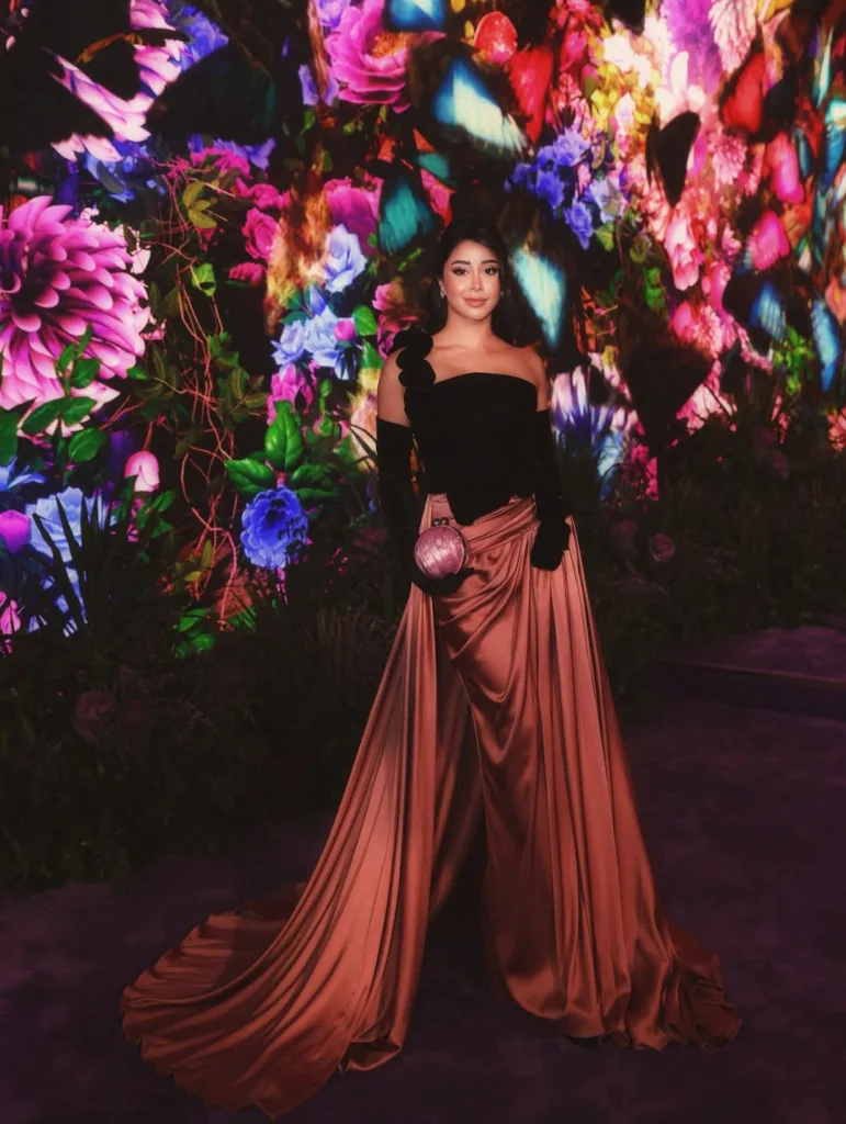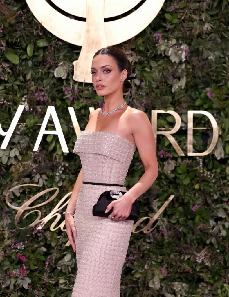 من أبرز الاختيارات للمجوهرات كانت أقراط الزمرد الكومثرية التي اختارتها النجمة دينا الشربيني من دار شوبارد لتتماشى مع فستانها الأسود المزركش من جورج حبيقة.