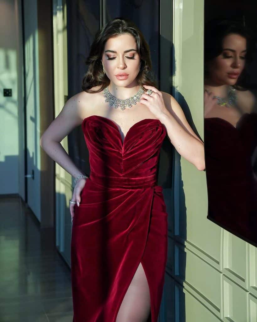 تألقت سارة أبي كنعان بإطلالة أنيقة مستوحاة من أجواء عيد الحب، حيث ارتدت فستانًا باللون الأحمر الداكن، لفت أنظارنا. تميز التصميم بتفاصيل رومانسية أبرزها الثنيات المنحنية التي شكلت شكل قلبًا على منطقة الصدر. تزيّن الفستان المصنوع من المخمل الدافئ، بعقدة جانبية عند الخصر مع شق ساق عالٍ أضاف لمسة جريئة على الإطلالة.