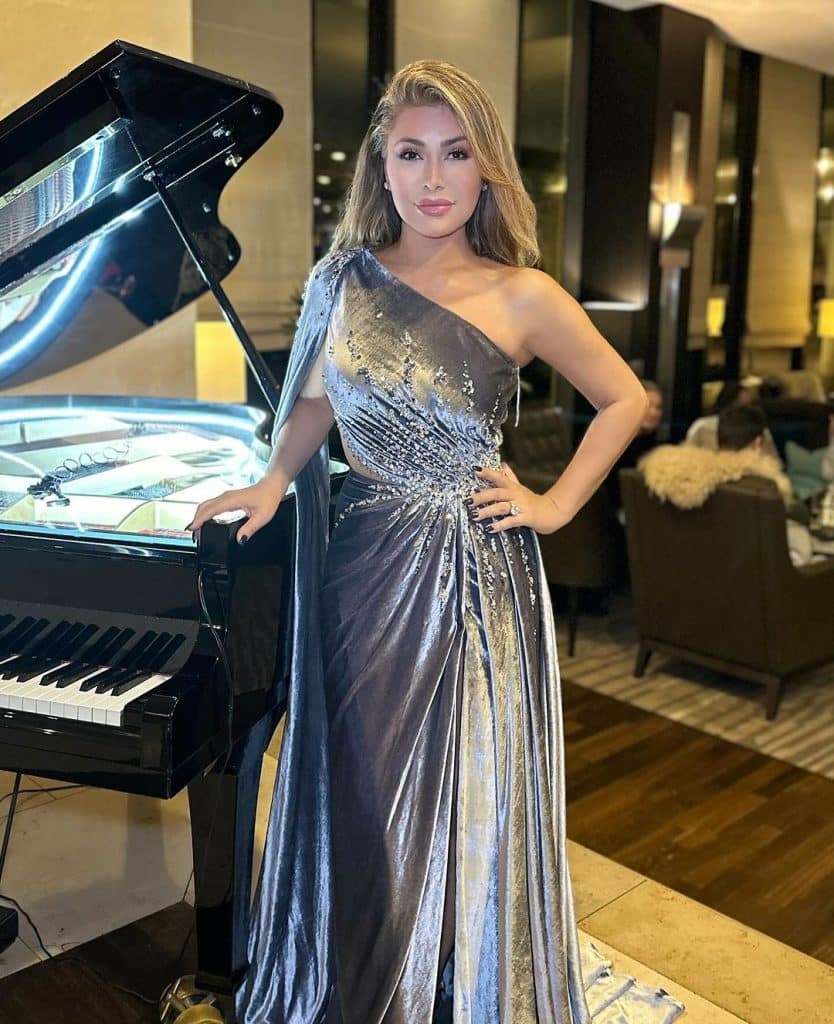 تألقت نوال الزغبي هذا الموسم بفستان طويل من المخمل اللامع باللون الرمادي الفاتح من توقيع لابورجوازي. تزيّن الفستان بعقدة جانبية، مطرّزة بالخرز والكتف الموصول بوشاح متدلي طويل فوق الذراع.