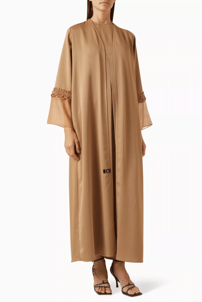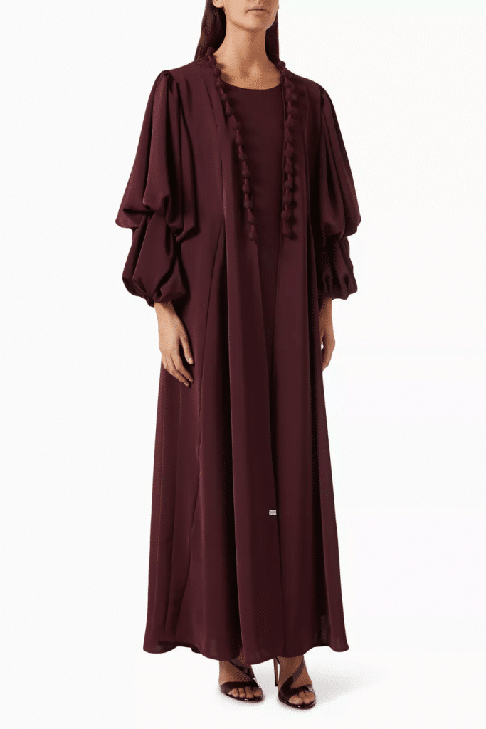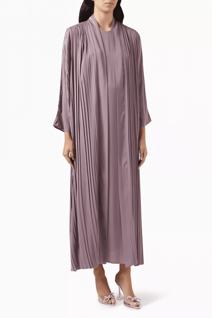 يعد ذلك الطقم من ذا اورفيك من أفضل الخيارات الأنيقة لإطلالتك بمختلف المناسبات، إذ يتكون من عباية صُنعت من كريب ندى الفاخر مع أكمام منفوخة ذات طبقتين، وفستان طويل تحتي بقصة كلاسيكية صُنعت من الحرير باللون نفسه.