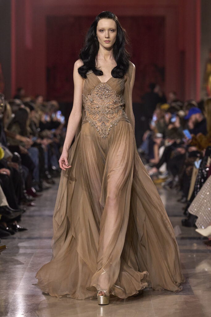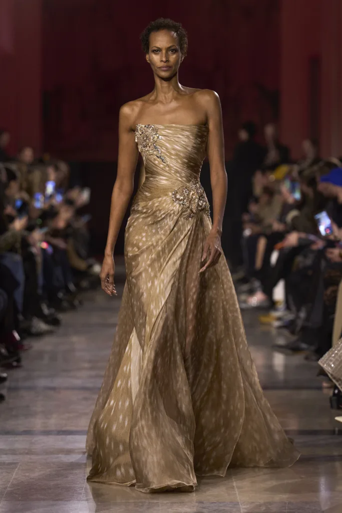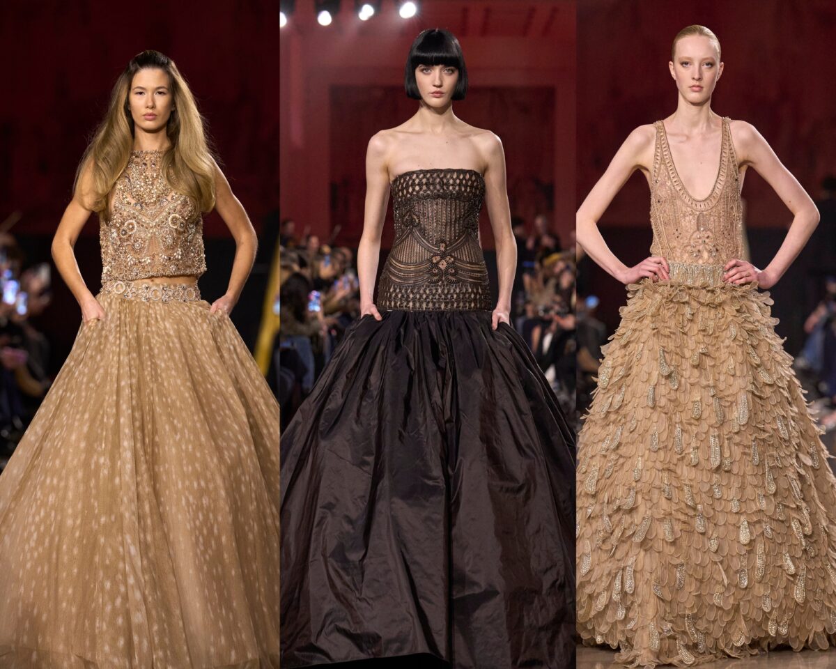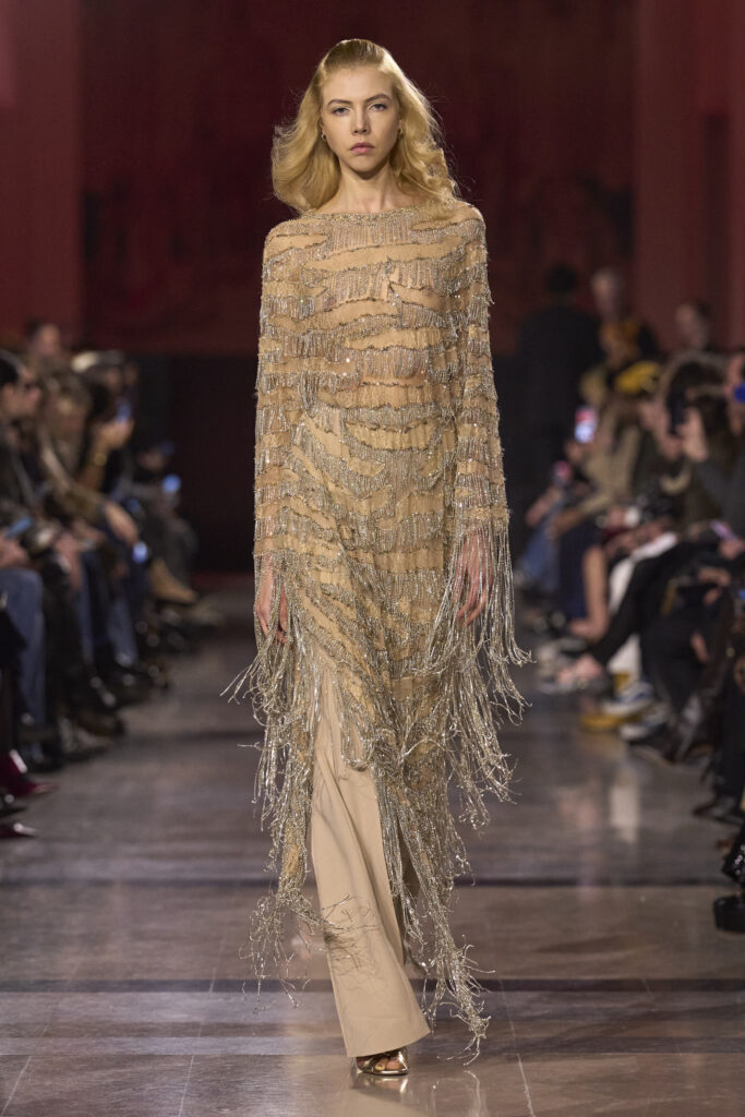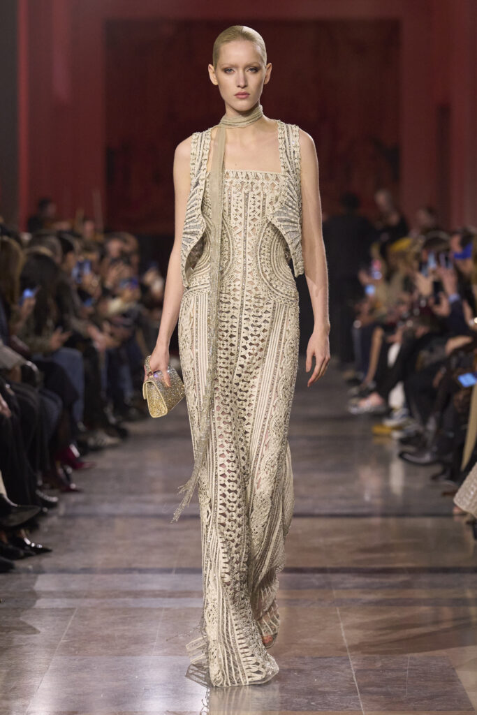 من كلمات ليالي الأنس في فيينا لأسمهان، نستهل الحديث عن مجموعة الخياطة الراقية من إيلي صعب لربيع وصيف 2026، التي أطلق عليها المصمم اللبناني اسم “ليالي السبعينات الذهبية”.
