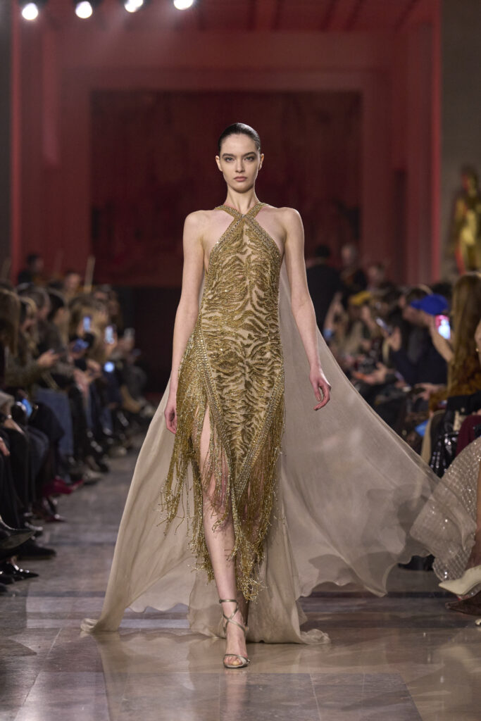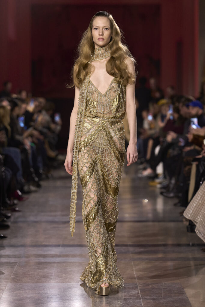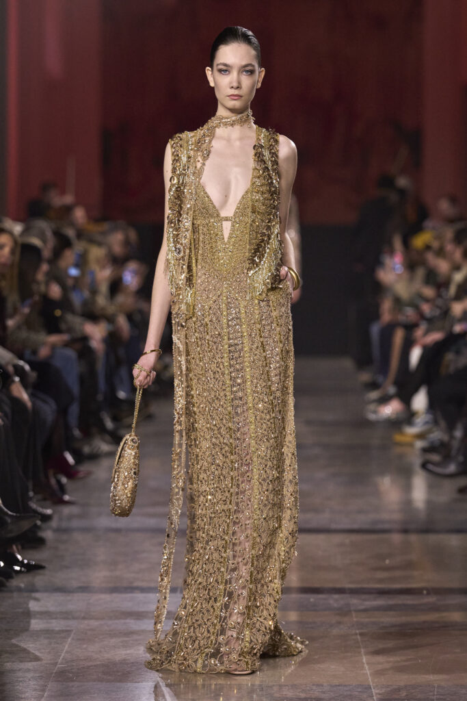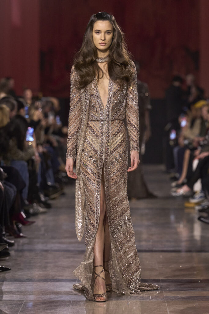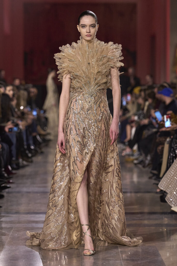 أراد صعب في هذه المجموعة أن يوقظ جمالًا لم يَعفُ عليه الزمن، لكنه بدأ يتوارى تحت صخب التطور المتسارع. هنا تتجلى الأناقة المتوهّجة بوهج الذهب الذي يطغى على معظم الإطلالات، وكعادته يبرز إيلي صعب الأنوثة، لكن هذه المرة عبر التركيز على أدق التفاصيل مهما صغرت، فيما يتراقص الضوء على الأقمشة ليجمع بين الرقة والقوة في آنٍ واحد.