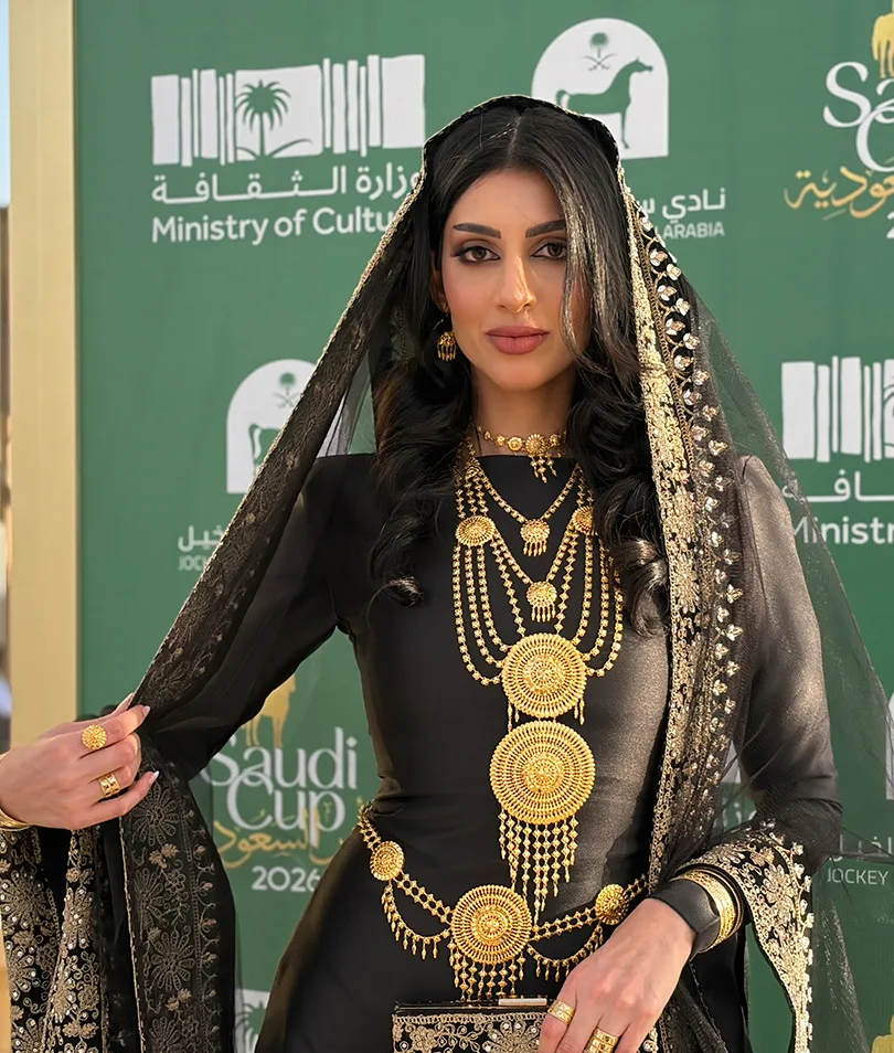 أكملت روان اللوك بمجوهرات ذهبية أصيلة أضفت لمسة فخمة وتراثية، ليصبح هذا الزي تحفة فنية تمثل تناغمًا بين الأصالة والتجديد، وتدخل ضمن أبرز إطلالات كأس السعودية 2026 التي تبرز التراث السعودي بأسلوب معاصر راقٍ.