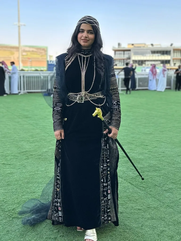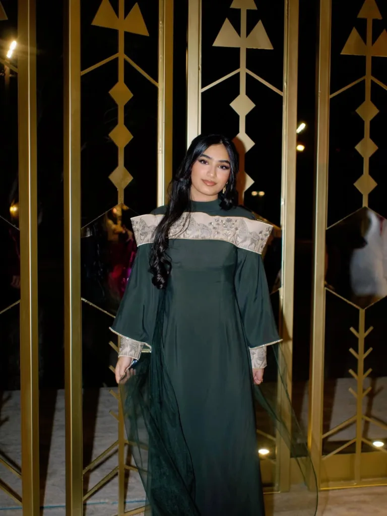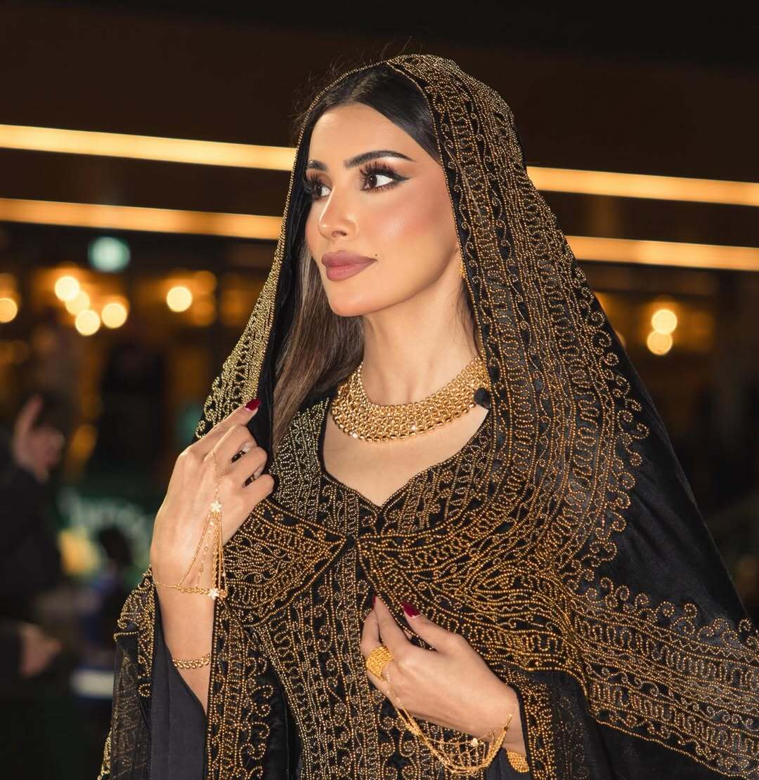 تألقت مدونة الموضة روان العمرو بزي أسود مستوحى من التراث النجدي، لكنه جاء بتصميم عصري يمنح الإطلالة حيوية معاصرة. تزين الفستان بتطريزات ذهبية دقيقة تحمل رموز الثقافة السعودية، مع طرحة مطرزة بخيوط ذهبية ثقيلة على الحواف مستوحاة من الزي التقليدي “الدقلة”.