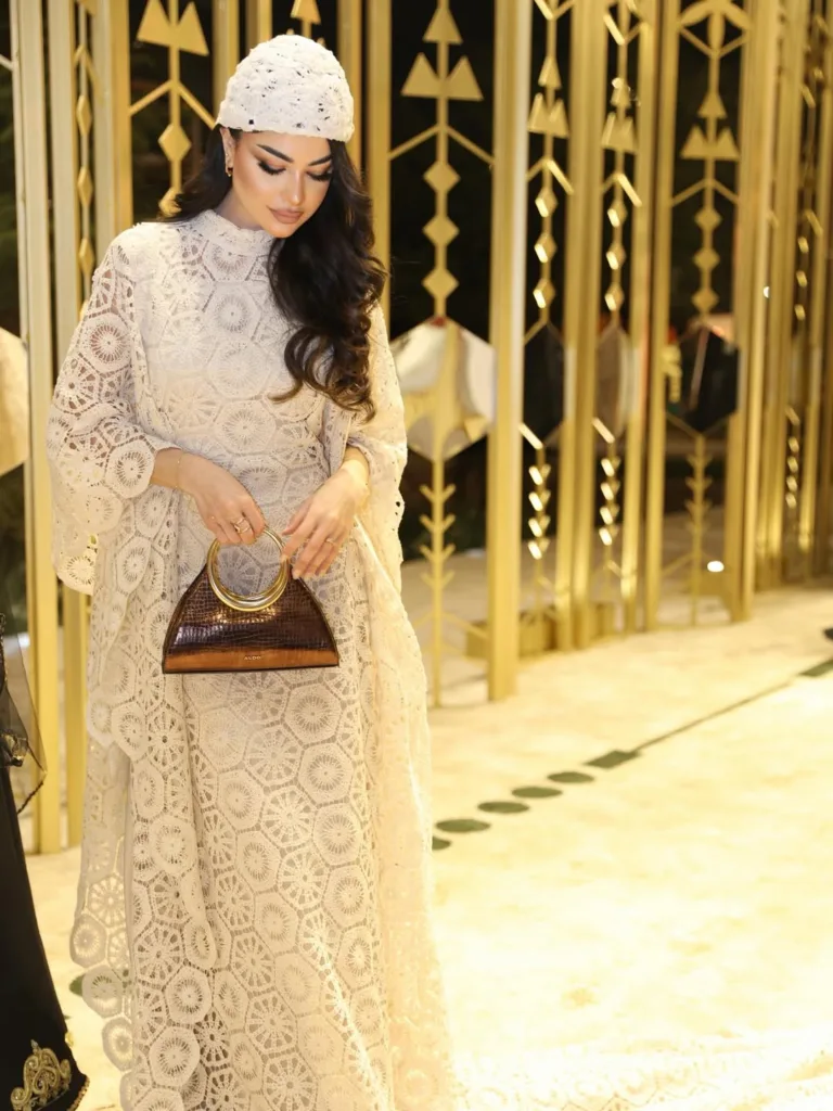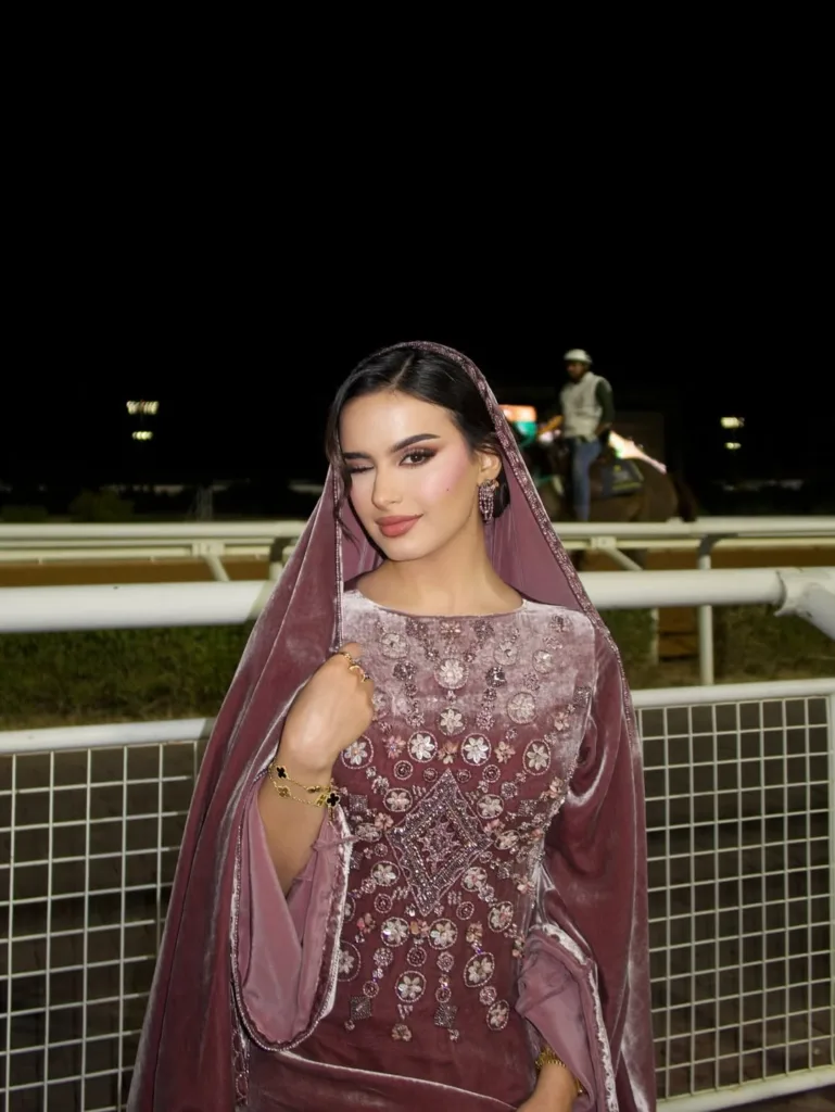 تألقت مدونة الموضة دانا التميمي بفستان من القطيفة الحريرية باللون الخزامي المميز للمملكة، مزين بتطريزات زهرية متلألئة أضفت لمسة فنية راقية على التصميم. أُكمل اللوك بطَرحة مطرزة بنفس التقنية اليدوية، لتعكس انسجامًا تامًا بين الفستان والإكسسوارات.