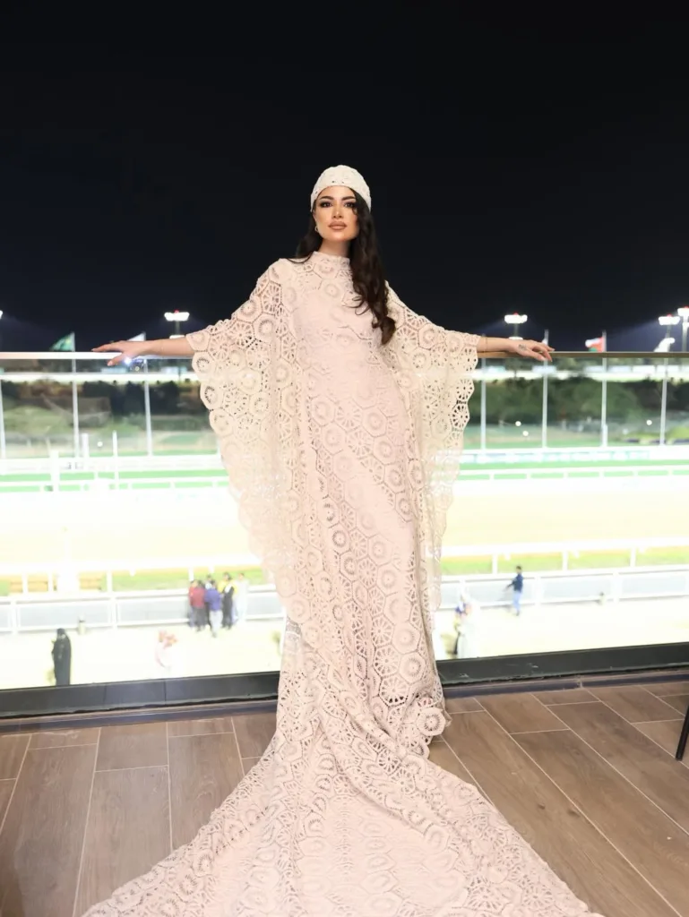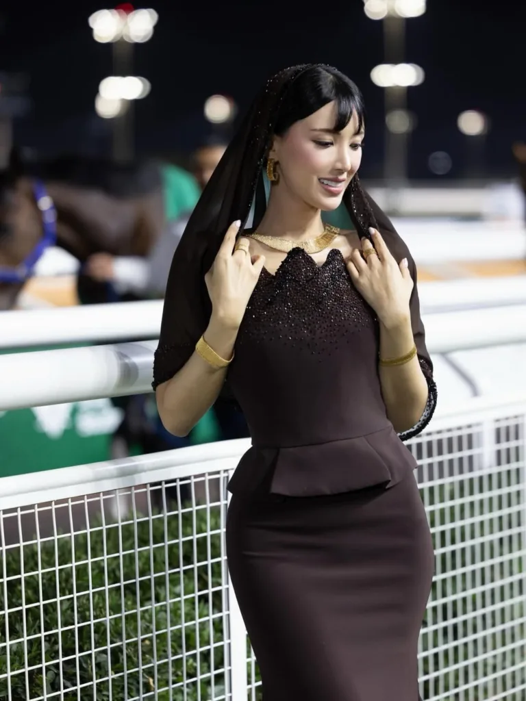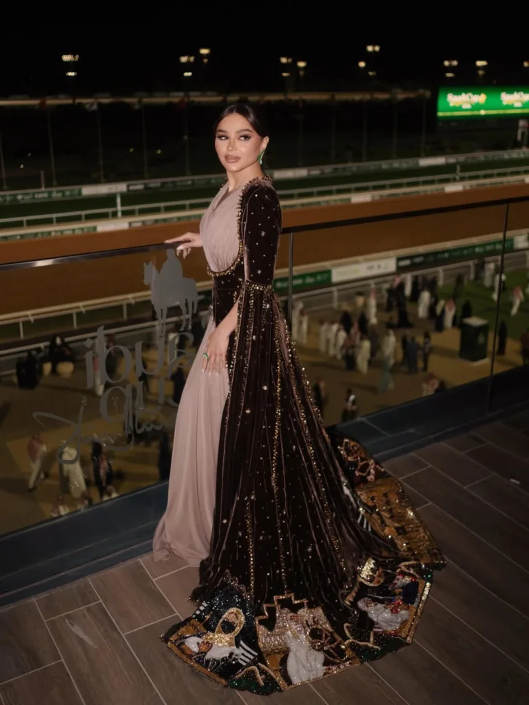 تألقت رند بن علي بفستان شرقي أسود مزين بعباية مطرزة عند الحواف بأسلوب فني راقٍ، مع إضافة مجوهرات ذهبية أنيقة أكملت الإطلالة بشكل فاخر. التصميم نجح في المزج بين الطابع التراثي واللمسة العصرية، مع التركيز على التفاصيل الدقيقة التي منحت الفستان طابعًا متفردًا ومهيبًا، لتكون هذه الإطلالة واحدة من أبرز إطلالات كأس السعودية 2026 التي تجمع بين الرقي والأصالة.