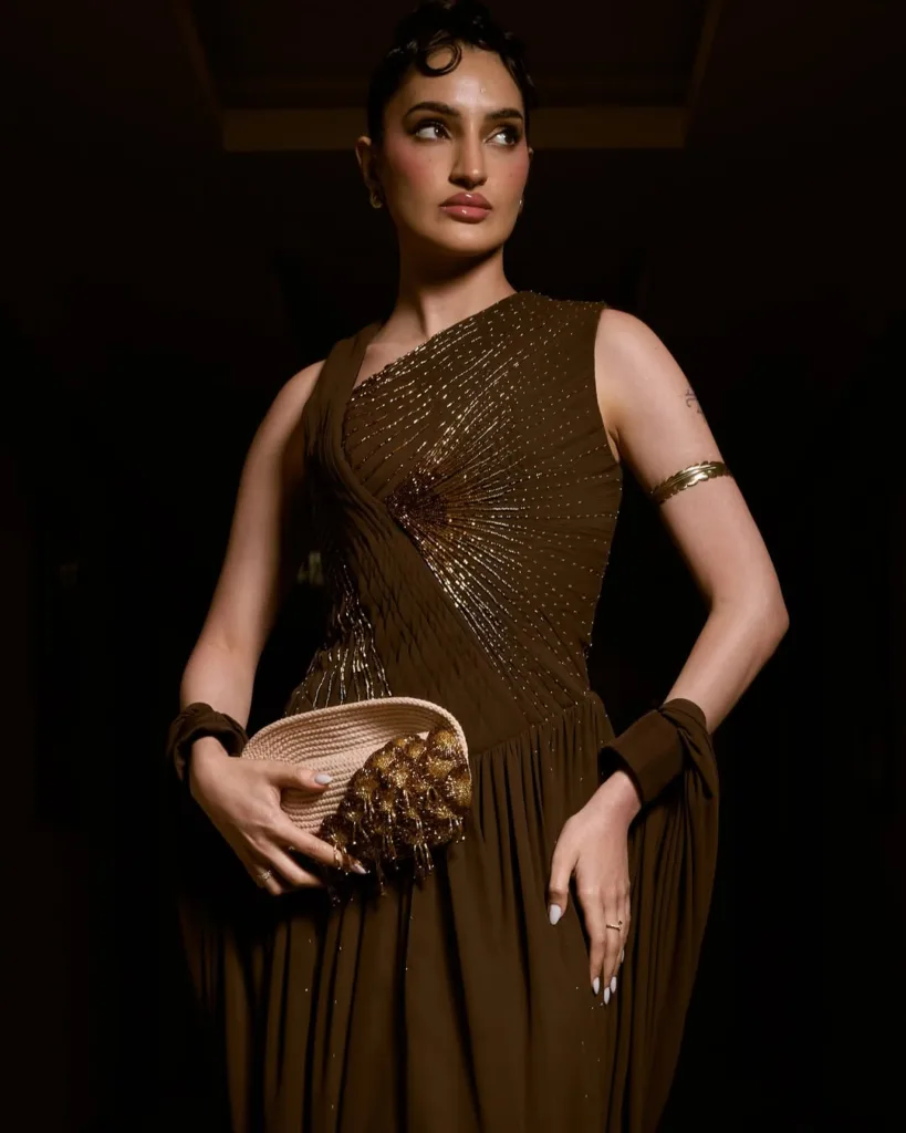 ظهرت نهى نبيل بفستان قفطان بني من دار أصايل لاين، حمل الطابع التراثي السعودي في أبهى صوره. تميز القفطان بالتطريز اليدوي الدقيق الذي استغرق شهراً كاملاً لإبرازه، مجسداً كرم الضيافة وعراقة التقاليد السعودية، ما جعل هذه الإطلالة واحدة من أبرز إطلالات كأس السعودية 2026 التي تحتفي بالأصالة والفن التراثي.