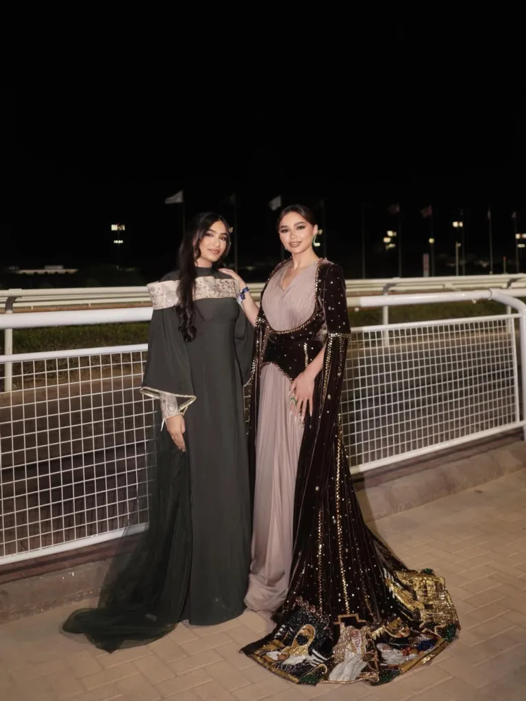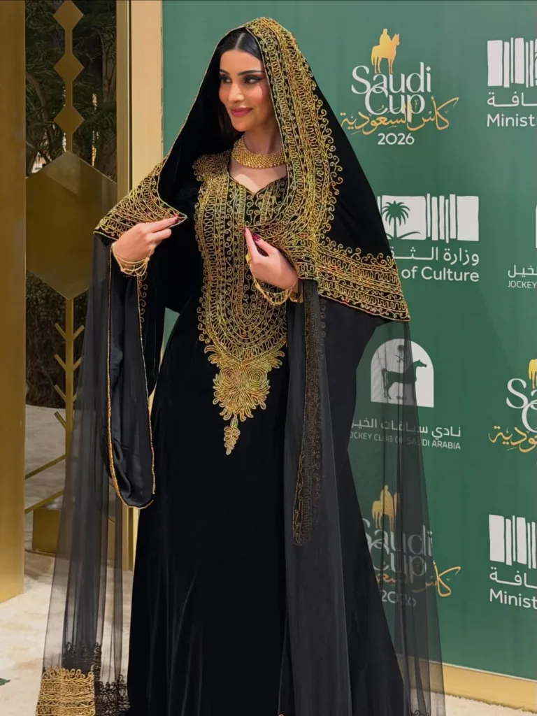 اختارت دانا العلي فستاناً شرقياً أسود، مزيناً بتطريز أبيض وفضي عند الصدر والأكمام، ليضفي لمسة فنية مشرقة على الإطلالة الداكنة. التصميم برز التفاصيل التراثية بدقة ملفتة، مقدمًا توازناً رائعاً بين الفخامة واللمسة التقليدية، لتصبح إطلالة دانا العلي من أبرز إطلالات كأس السعودية 2026 التي تجمع بين الحداثة والأصالة.