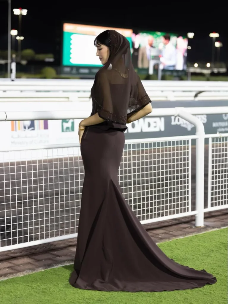 اختارت نوره عبدالعزيز فستانًا أسود راقيًا من توقيع المصممة نوره الخليوي، مزينًا بتفاصيل دقيقة أضافت بعدًا فنياً فخماً على الإطلالة. أكمل اللوك وشاح طويل بني على شكل كاب انساب من الرأس إلى الأسفل، مانحًا الإطلالة طابعًا ملكيًا مهيبًا. جمع التصميم بين الحداثة واللمسات التراثية بأسلوب متقن، مع إبراز العناية بالتفاصيل الصغيرة التي جعلت الإطلالة متكاملة ومتألقة، لتكون واحدة من أبرز إطلالات كأس السعودية 2026 التي تعكس التوازن بين الرقي والفن التراثي.