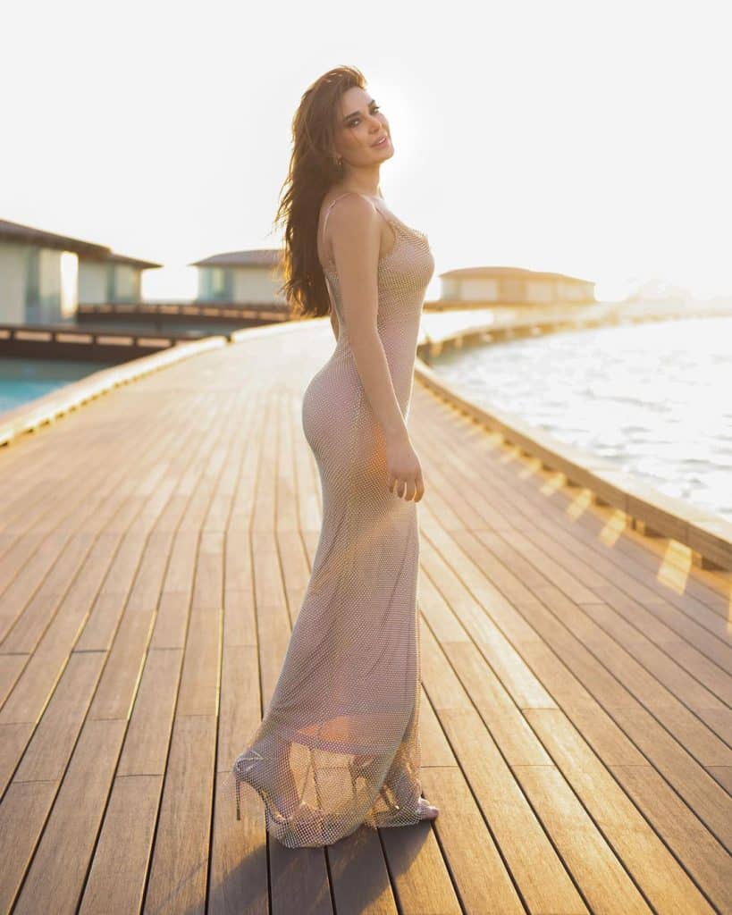 وقد أتت إطلالة الفنانة اللبنانية سيرين عبد النور مختلفة ومميزة باللون البيج الكريستالي بتصميم طويل مجسم مع حبيبات براقة لامعة ملأت الفستان بأكمله، مع حمالات رفيعة على الكتفين وبدون أكمام، وقد نسقت معه حذاء ذهبي بكعبٍ عالٍ رفيع، تاركةً شعرها منسدلاً ببساطة مع لمسات رقيقة وهادئة من المكياج النود الذي راق لها كثيرًا.