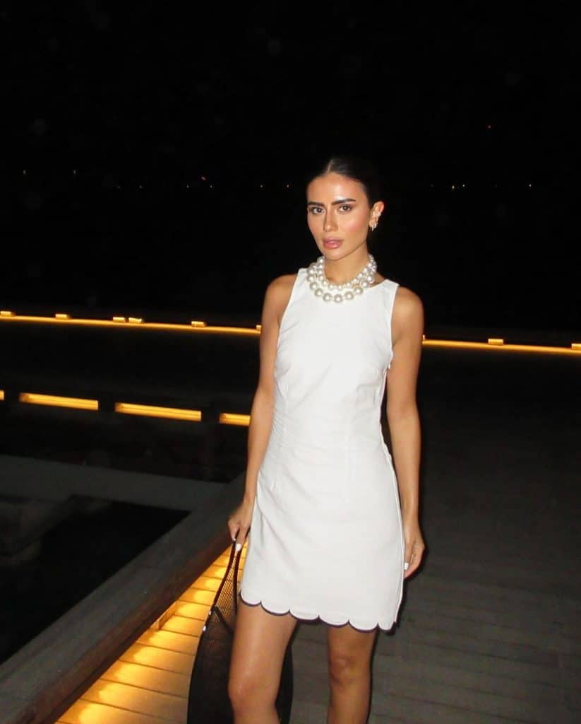 اختارت المؤثرة شوق محمد إطلالة بفستان أبيض متباين الأطوال أتى قصير من الأمام لينسدل من الخلف طويلًا وزينت إطلالتها بإسورة وعقد من اللؤلؤ ومجموعة خواتم، بينما اختارت في المساء إطلالة باللون العاجي نهاياتها مزينة بالريش بصيحة الكم الواحد، مع تصفيفة شعر ذيل حصان رقيقة.
